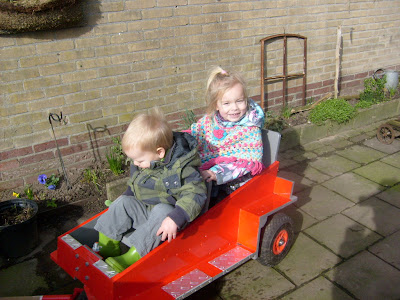 Wat een mooie kar heeft opa gemaakt, wat heerlijk toch als je kleinkinderen hebt, dan kan je nog eens wat maken, en je appeljas helemaal superleuk.