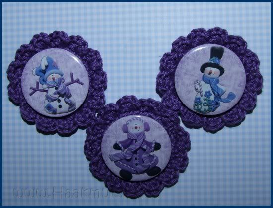 Ik blijf me toch een beetje bezig houden met de buttons gewoon omdat het zo ontzettend leuk is ze te ontwerpen en te maken. Ik ga ook een apart blog maken waar ik de buttons neer kan zetten. Van deze buttons heb ik een leuke broche gemaakt, het haakwerk met veiligheidsluiting is bevestigd aan de button zodat deze gedragen kan worden als broches.Ik zelf vind ze best leuk en grappig geworden.