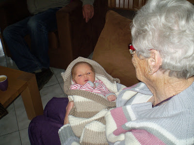 Dit is mijn moeder met Nina.Deze trappelzak was de eerste die ik gebreid had,maar hij bleek veel te groot.Toen heb ik de kleine roze gemaakt.Die andere twee heb ik voor haar zussen gebreid.