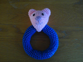 De juf van de majorette van Natasja heeft vorige week verteld aan de kids dat ze zwanger is. Natasja helemaal in de wolken natuurlijk. Maar gelijk de vraag: mam, maak jij wat leuks voor de baby. Wij met z'n tweetjes aan het zoeken gegaan naar een patroontje. En we hebben wat gevonden. Een rammelaar. Maar ik had natuurlijk geen belletjes in huis. Dan maar zonder belletje was het antwoord van Natasja. Hieronder het resultaat. Ik denk alleen dat ik het mondje er nog even op nieuw op ga zetten want nu ik de foto bekijk zit de mond wel erg scheef.
