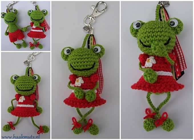 Het was natuurlijk wel een uitdaging om voor kikkie het kikkertje een vriendinnetje te maken, alleen is ook maar alleen. Volgens mij is het wel gelukt, wederom een gepriegel maar weer een hele uitdaging want ik heb alleen maar een patroon van de basiskikker dus ik moest nog een jurk ontwerpen voor vriendinnetjelief. Ik heb die maar in de kleur van de broek gehouden zodat het nu een echt setje is.