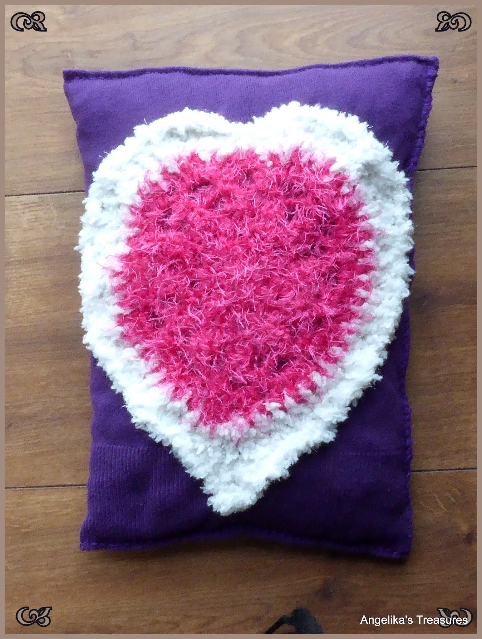 Zelfde hartje, maar dan met knuffelwol gehaakt. 30-20cm. ![]() Kussentje gemaakt van een oud t-shirt. |