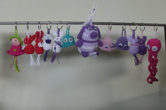 Een vriendin van mijn dochter heeft een stand en beiden zouden ze willen spullen verkopen. Nu moet ik zeggen dat ik alles vrij snel weggooi/geef indien ik het niet meer kan gebruiken of nodig heb. Dus kwam de dochter op de proppen om sleutelhangers en andere spulletjes te verkopen op die markt ;.)) Alleen.... de mama moet ze haken!! ;.)) Ik heb ook in juni in opdracht voor de zoon ongeveer 30 sleutelhangers gemaakt op bestelling voor zijn vriendjes ;.)) vandaar dat de zus ook iets wou doen!! ;.)) ( de mama extra werk geven, haha)