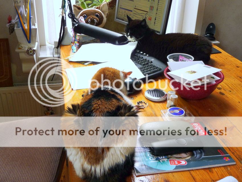 Mooie katten! Ha, ha, dat neusje van de hond. Gezellig dat het hele spul bij jou is als je aan het werk bent.