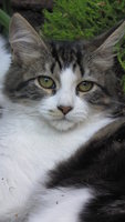 Moeders was een huistuin en keukenkat. Toen we haar op gingen halen, was zij van de 4 poesjes nog de enige die niet uitgezocht was. Terwijl zij het enige pluizige katje was. Waarschijnlijk is haar vader een Noorse boskat. Wisten toen nog niet dat het zo'n mooie poes zou worden.