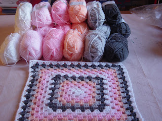 Ik heb 6 bolletjes a 50 gram van iedere kleur, maar ik heb volgens mij wel veels te veel, maar ik ben ook van plan om de deken groter te maken als hij staat afgebeeld. Ik heb nu de vier grote granny's klaar en van de tussenmaat 11 stuks en ik heb 1 bolletje van elke kleur op.