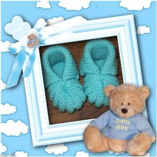Een moeder die ik goed ken van school was zwanger van de 3e en ze wist dat ze een zoontje kreeg, na 2 dochters. Dus ik zei tegen haar: Ik ga leuke blauwe slofjes voor je breien! Ja hoor zei ze hard Toen ik na de geboorte met de slofjes aan kwam, keek ze er met rode wangen naar en bedankte ze me hartelijk. Ze vond ze super leuk en maakte haar excusses omdat ze gelachen had Dit zijn ze!