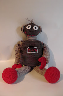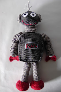 Ik wilde ook eens iets voor een jongen maken. Ik zag dat Babsie´s Hook een heel leuk patroon van een robot had. Maar ja, dat is wel een Duits patroon en dat had ik nog nooit gedaan. Maar met een Duitse vertaling erbij ging het eigenlijk heel goed. In het patroon staat een fijne uitleg met duidelijke foto's, dus het kan eigenlijk niet fout gaan. Ik vind hem echt super leuk geworden. Elke keer als ik er naar kijk schiet ik in de lach, omdat hij zo'n geinige snoet heeft.