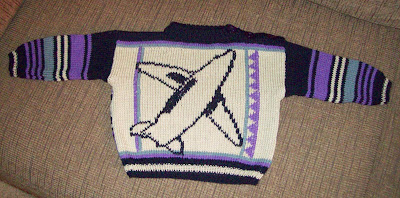 Na diverse roze creaties voor kleindochter Lieke,  een stoere trui voor kleinzoon Levi. De achterkant is gestreept.Ik ben geen ster wat breien betreft, maar gelukkig is een klein maatje nog te overzien.