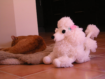 klein wit hondje,alleen was het heel veel werk,de kat trekt zich er niks van aan,en is ook niet bang van hem.