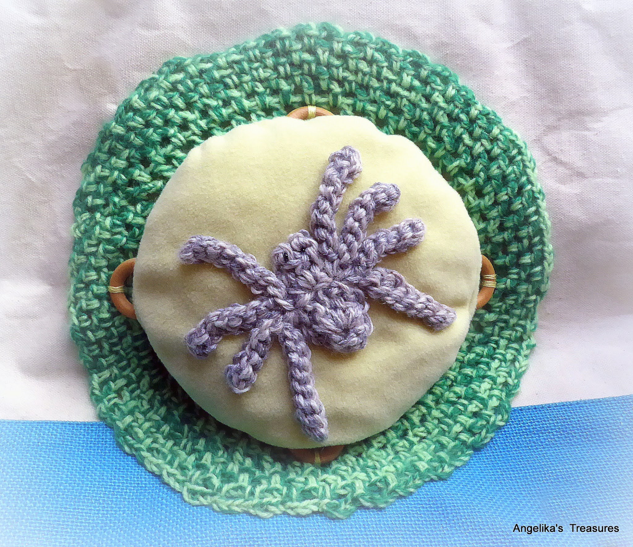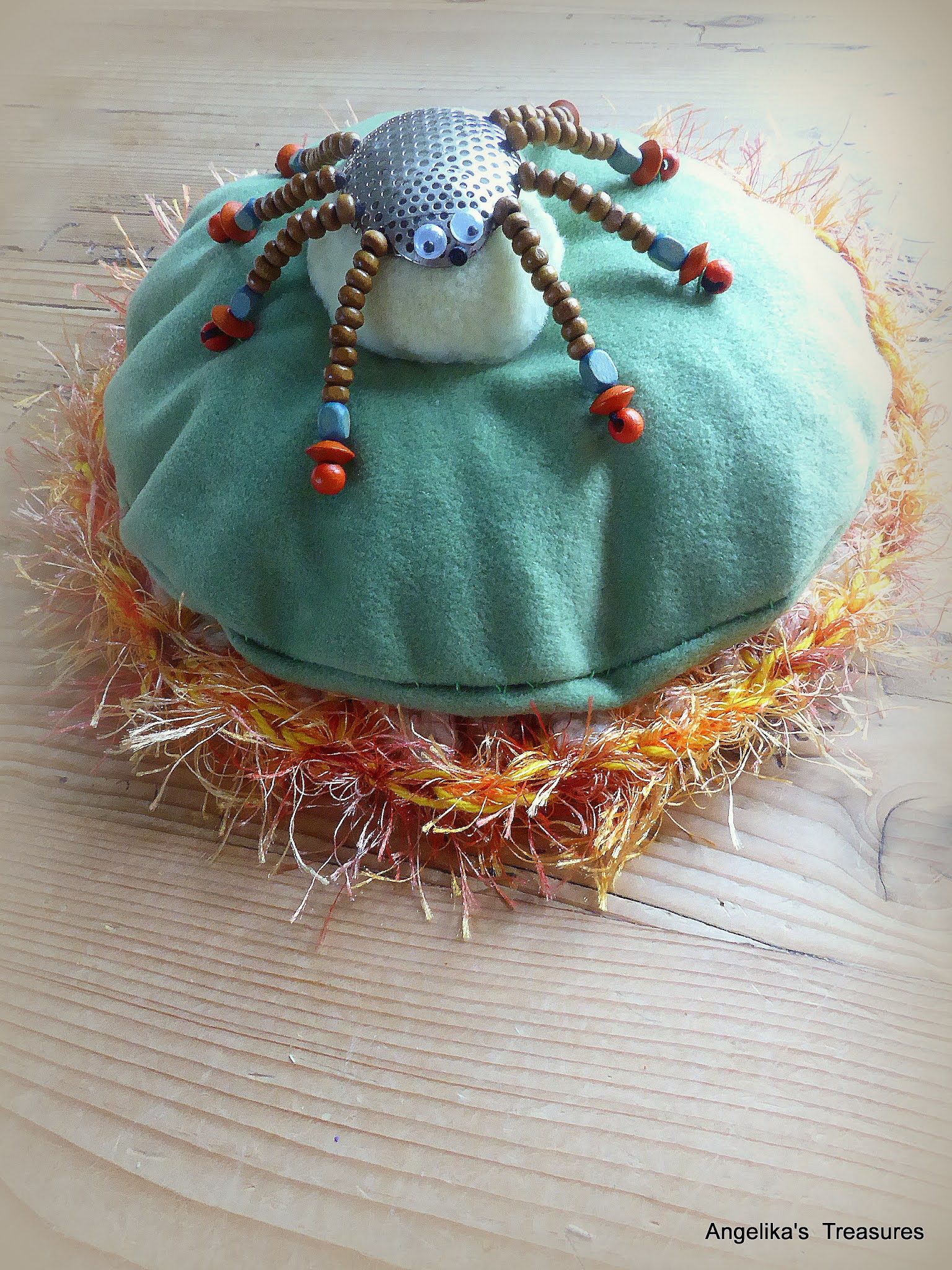 De spin is op de tas die ik gebruik voor school genaaid... Hij is zo'n 12 cm breed, dubbele draad gebruikt. Patroon via youtube. De kralenspin is een eigen verzinsel , lichaam is zo'n 4 cm groot. |