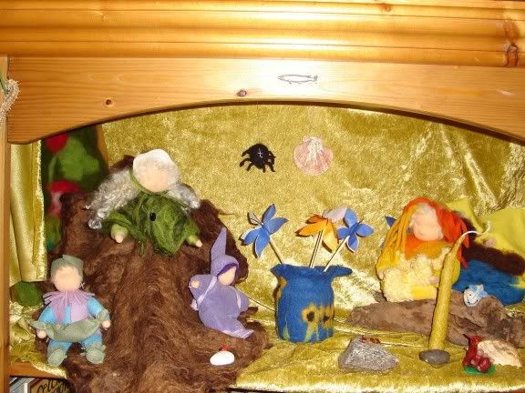 De bruine rok van moeder aarde heb ik zelf gevilt en het blauwe potje met de zonnebloemen heeft mn zoon gemaakt toen hij 7 was. Het is een vilten lapje om een jampotje heen. De andere popjes heb ik allemaal zelf gemaakt. Dit is trouwens mijn seizoentafel. Inmiddels ontmanteld bij gebrek aan plaats voor mn boeken Op internet staat heel veel info over natvilten. |