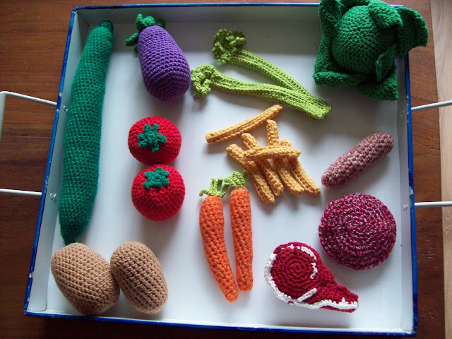 voor bij het speelkeukentje van kleindochter Lieke: de dagelijkse boodschappen, aardappelen,vlees en groente. Smakelijk eten,
