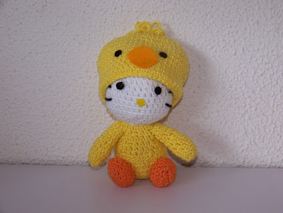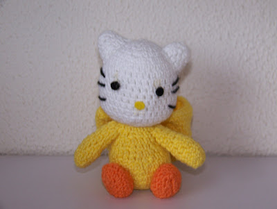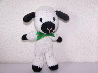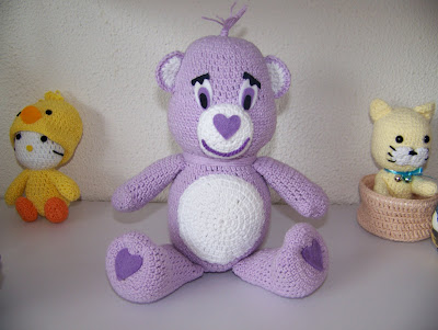 En Share-bear met nog een witte buik, ik heb m met te dunne garen gehaakt, waardoor ik eerst in de problemen kwam met de hartjes voor de pootjes en de neus, daar heb ik vilt voor gehaald, toen bleken de lolly's die op de buik horen, ook niet te passen